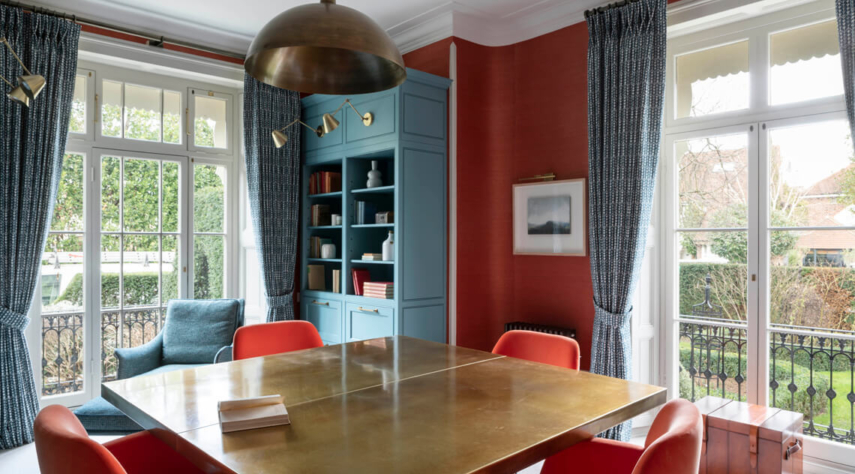 Turn the other way and one finds oneself in an elegant library, where the centrepiece is a brass topped signature Matthew Cox table. The cabinetry and shelving take a traditional in-frame style, with cock-bead detailing and Hector Finch brass lighting. Hand-painted in Paint & Paper Library’s Blue Gum, the library wraps three sides of the room. The fireplace wall remains neutral, flowing seamlessly out into the hallway where Christopher Farr’s ‘Travelling Light’ wallcovering and a Roger Oates Venetian Flatweave Mandarine runner adorn the curved walls and feature spiral staircase.